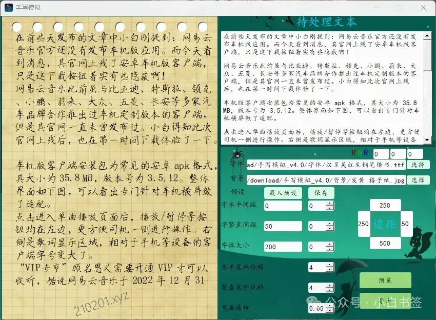 使用也很简单,右上角待处理文本处粘贴内容,选择字体和背景并设置参数(如果不知道怎么设置,可以先“载入预设”参数后,根据情况再调整),点击预览,没有问题点击“导出”即可。