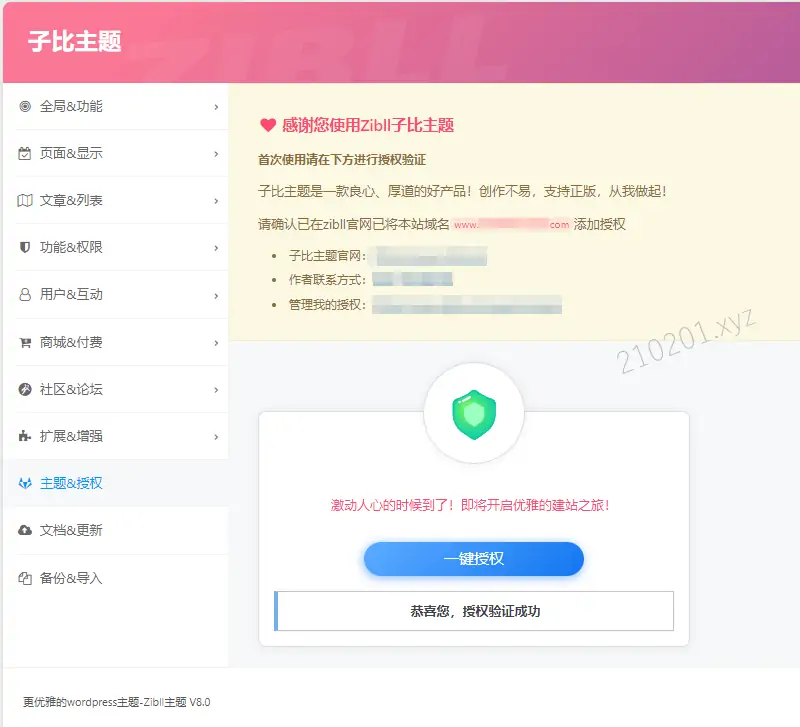 5、回到网站后台主题设置,点击“立即授权”-“一键授权”,等待授权成功即可。